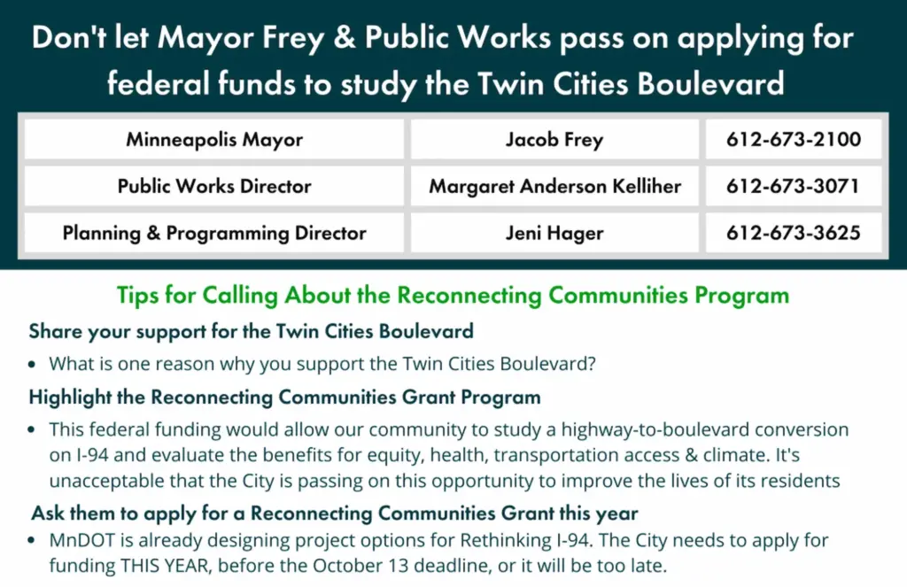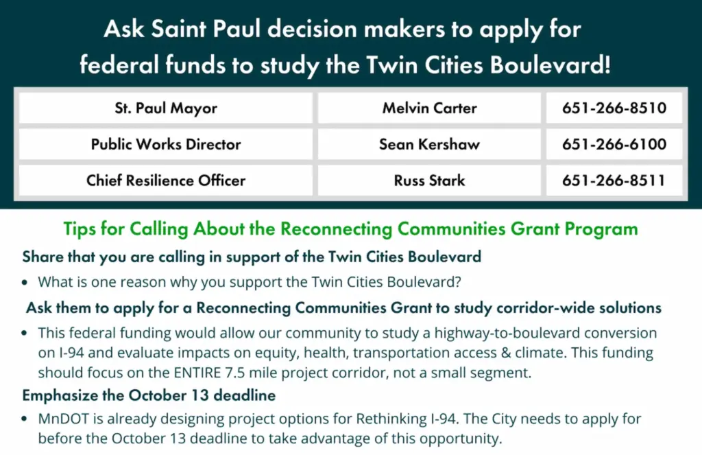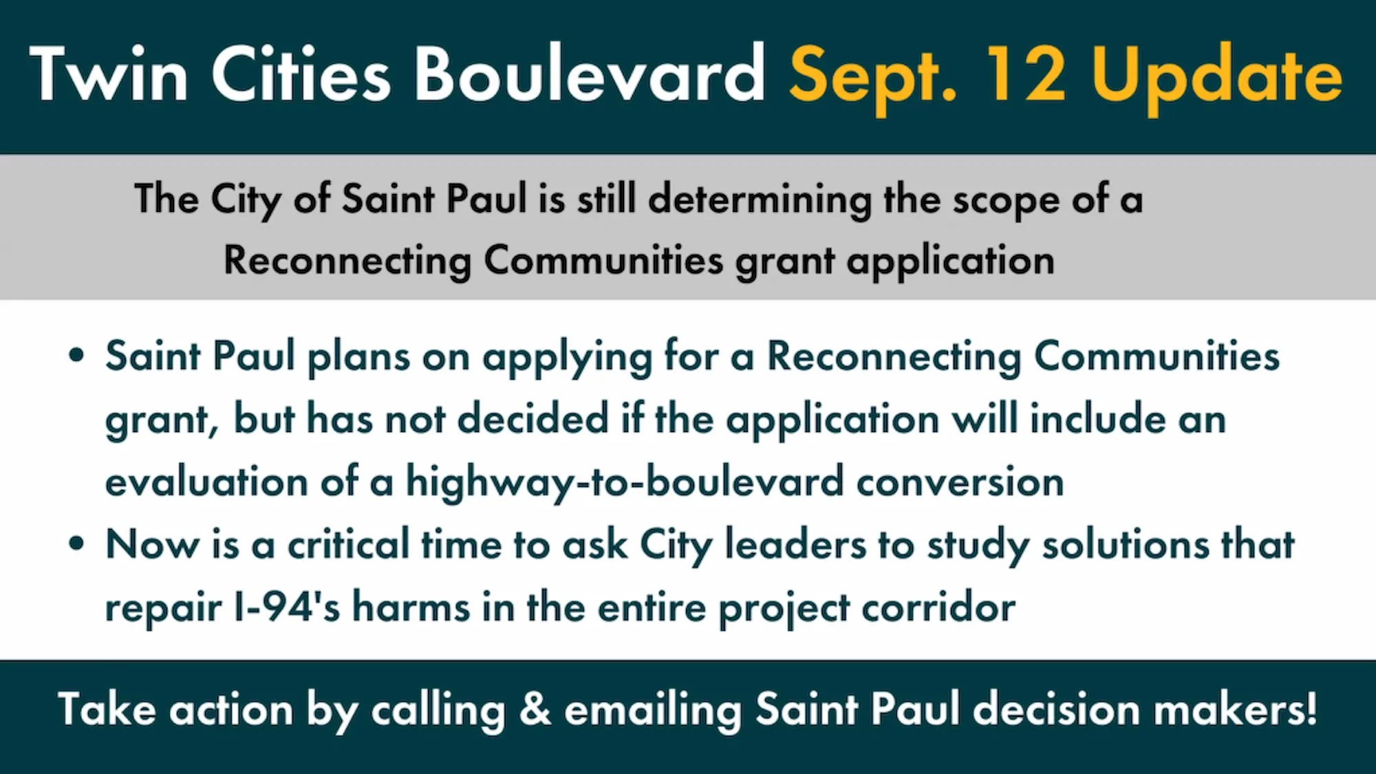Last week, we met with representatives from the City of Saint Paul to discuss the upcoming application deadline for the Reconnecting Communities Pilot Program and to reiterate our ask that the City apply for a planning grant to study the Twin Cities Boulevard.