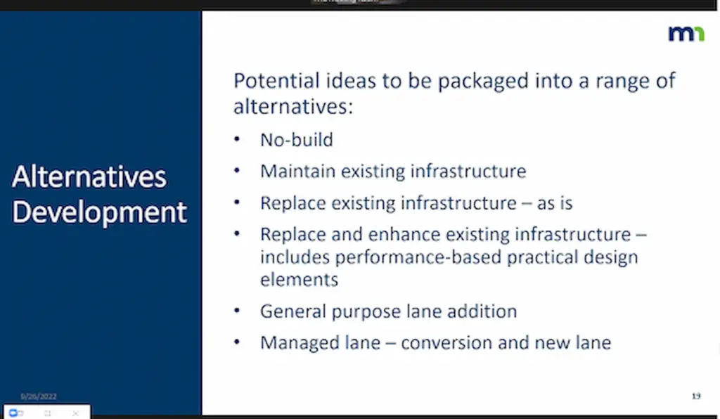 We are concerned that MnDOT will initially include one boulevard conversion option in the project alternatives, only to strike it from consideration early in the process. MnDOT will likely include many different configurations for a rebuilt highway in the project alternatives. The same should be done for boulevard conversion options.