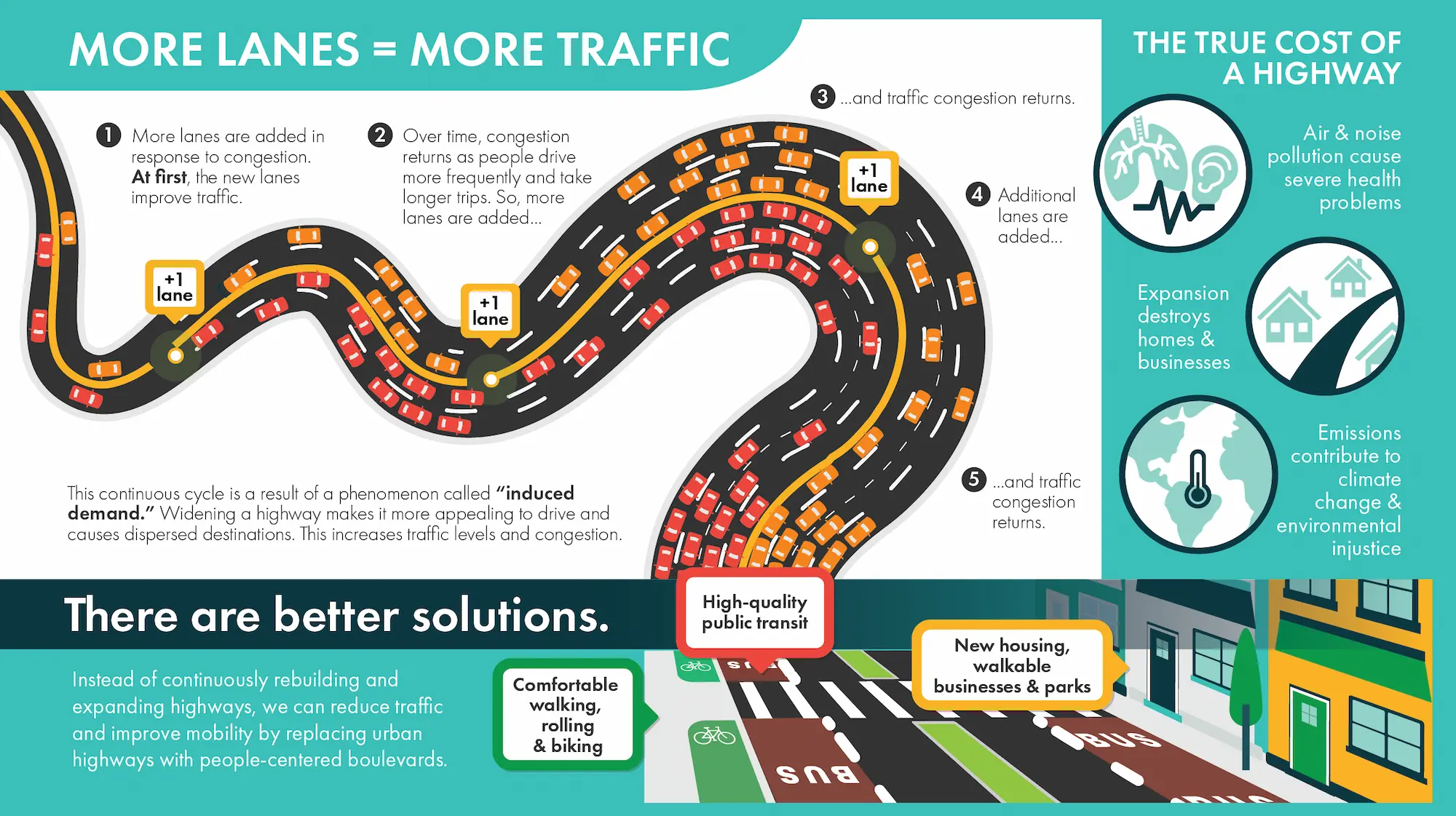 an infographic explaining how more lanes encourages people to drive more, making congestion return