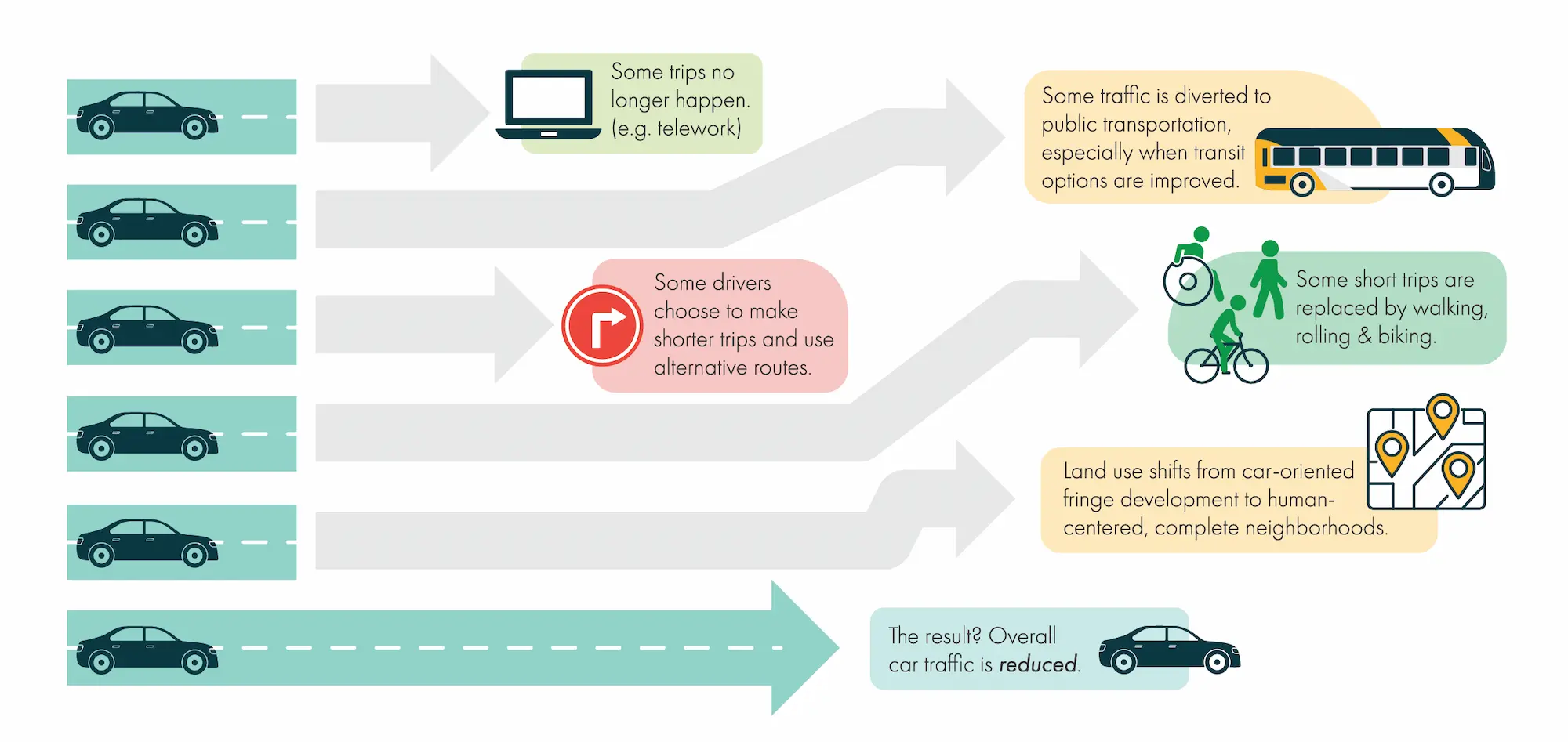 infographic showing the various ways people make different choices when incentivized to do so, called mode shift and traffic evaporation