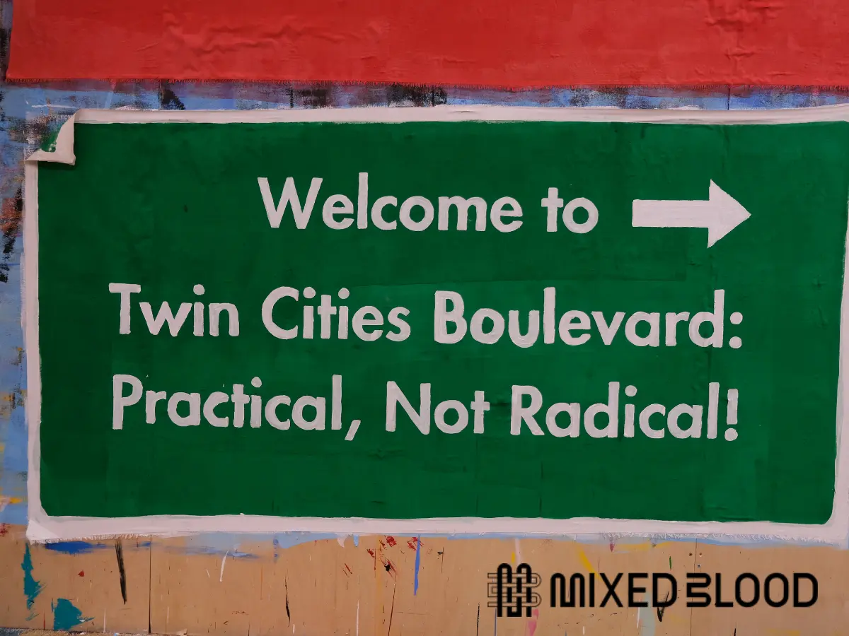 "welcome to twin cities boulevard: practical, not radical!" with mixed blood logo