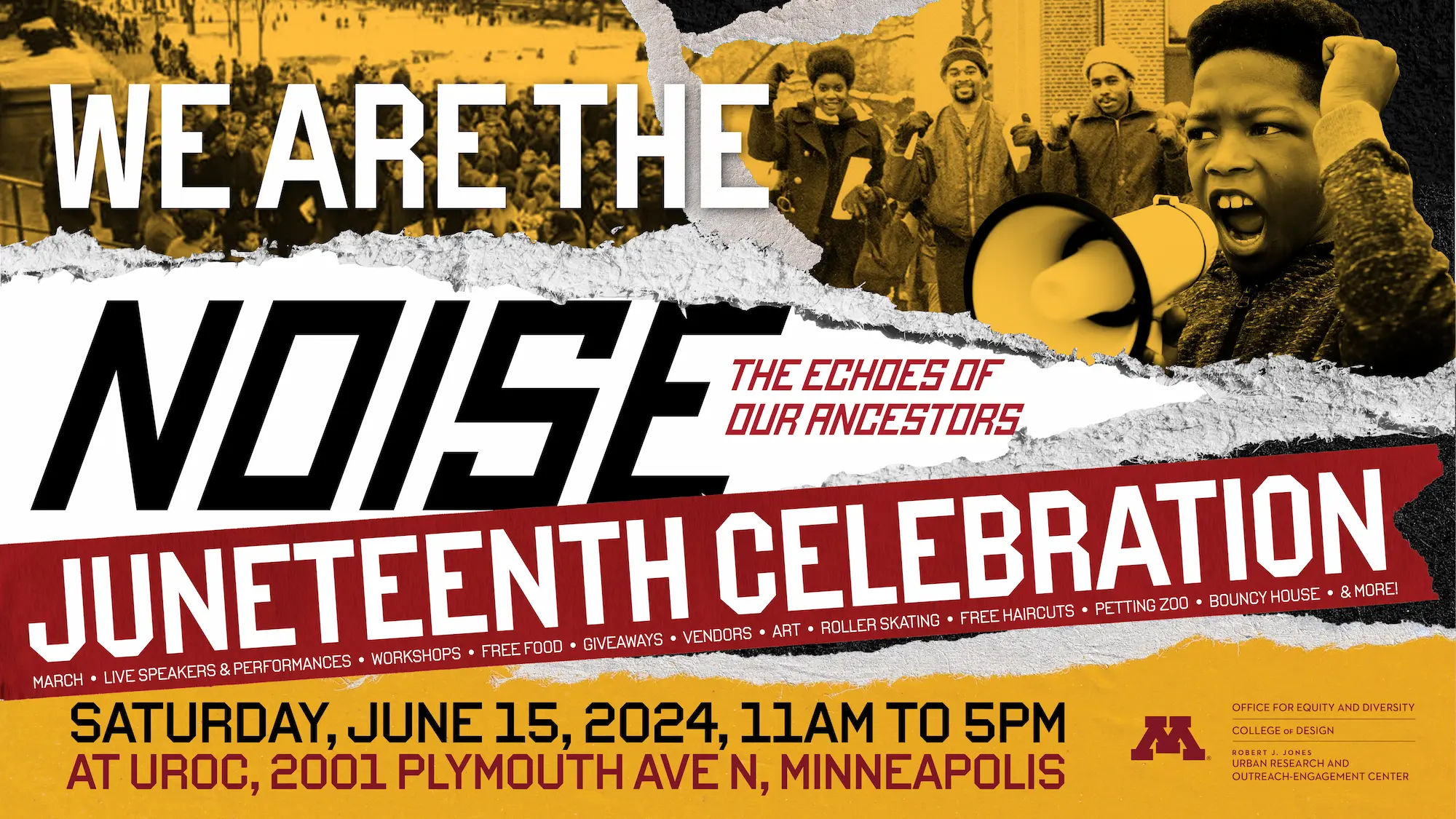 The University of Minnesota will host its third annual Juneteenth Celebration block party and commemorative march in North Minneapolis on Saturday, June 15, 2024, from 11 am to 5 pm. This free event – centering on the theme of We Are the Noise: The Echoes of Our Ancestors – will feature Black vendors, speakers, workshops, poster showcases, storytellers, musicians, performers, DJs, roller skating, books, free food, free haircuts, art-making, a bouncy house, a petting zoo, and more. The event will be held at the University’s Robert J. Jones Urban Research and Outreach-Engagement Center (UROC). This event, led by Professor Terresa Moses, is presented by the Office for Equity and Diversity and the College of Design.