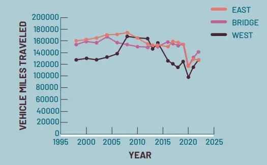 Looking at historic traffic trends on MnDOT’s website, traffic volumes on I-94 in the study area peaked between 2004 and 2008. Volumes declined significantly during the pandemic. Overall, VMT is back to 2019 levels, but travel patterns and behavior are different, with more non-work trips made throughout the day.