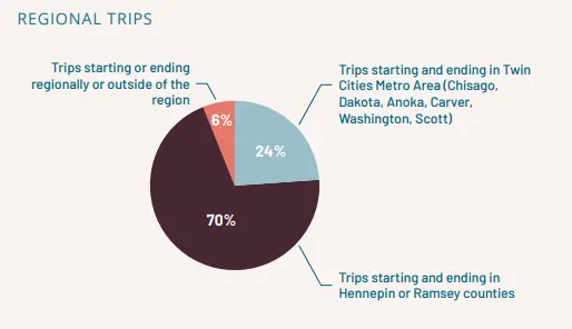 I-94 serves significant daily traffic compared to other highways in the region, but most of these trips use I-94 within the project limits for short distances. The most common trips and most visited destinations accessed from the project corridor are almost exclusively within the Twin Cities. Most trips start and end within Minneapolis or Saint Paul.