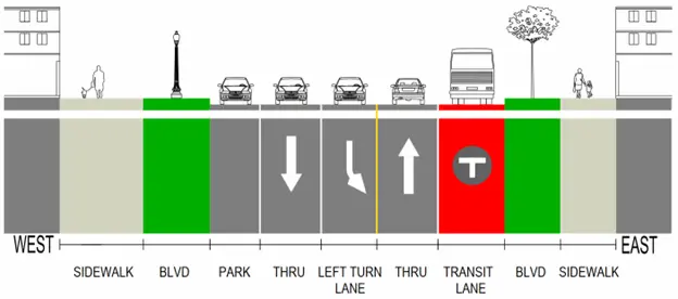 - Includes a bus-only lane, but only for a small portion of the project area north of 24th Street