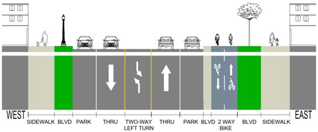 - Includes a two-way bikeway; although the bikeway ends south of 29th Street